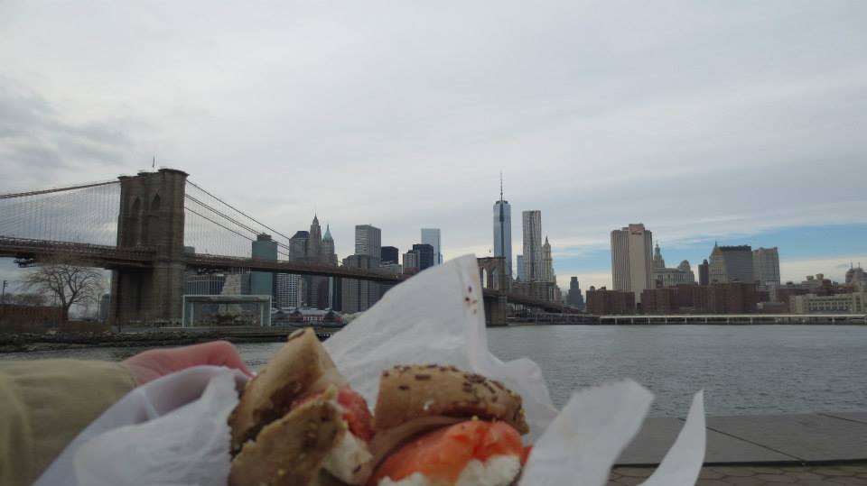 050 To eat a Salmon bagel with capers and cream cheese at Dumbo, looking at Brooklyn Bridge and Manhattan.
