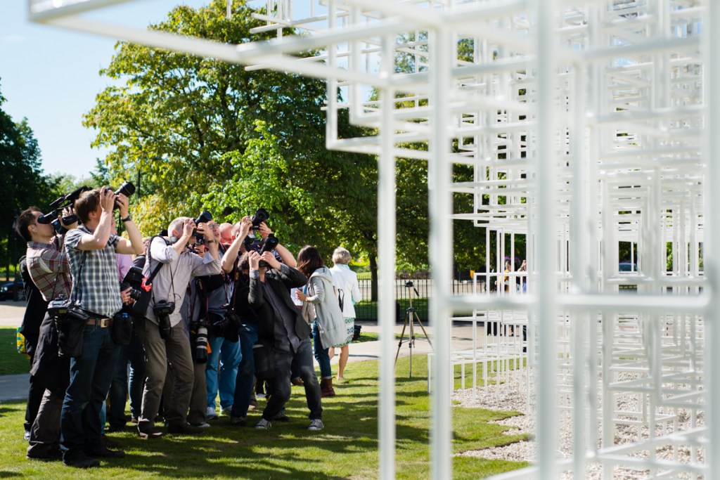 This building only existed for a matter of months before being taken down (it was planned as a temporary structure) and over the summer it was photographed many, many times by lots of different people, not least on it’s opening day. I find this idea, of a scrum of photographers photographing a building quite humorous and perhaps casts a different eye over it. This sort of behaviour is usually the reserve of paparazzi spotting an A-list celebrity. Here, the building is the superstar.